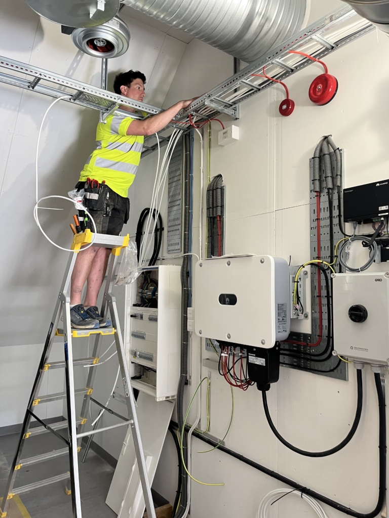 På plats i Arlöv har Provektor Rickard Ziegler och Joel Jönsson. De monterar armaturer, kopplar centraler och installerar data. Tidigare har solceller installerats.
